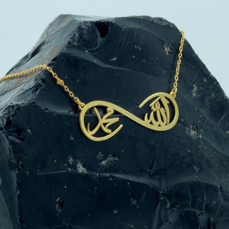 An Infinity Islamic necklace typically incorporates Islamic symbols or phrases within the infinity symbol design.