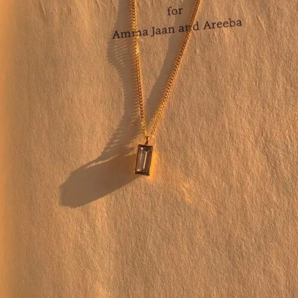 At its heart lies a radiant rectangular pendant adorned with a captivating solitaire stone, meticulously cut to emulate the brilliance of a genuine diamond. The pendant delicately hangs from a sleek and smooth chain, adding a touch of understated glamour to any ensemble.